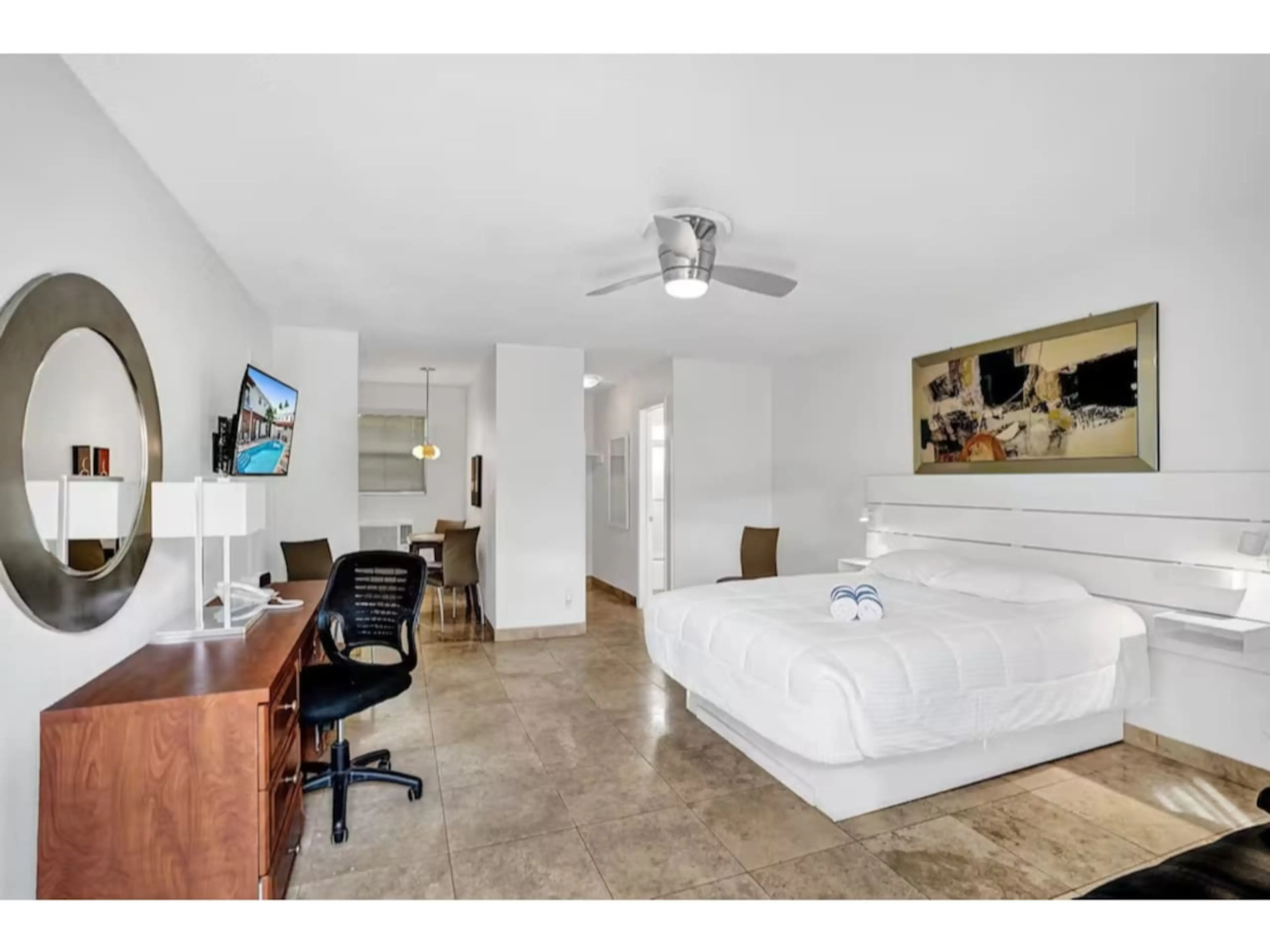 Settle into this inviting, open-concept studio just minutes from the beach. Featuring a spacious layout with a double bed, sofa, full kitchen, dining nook, and a dedicated workspace, it's ideal for a relaxing escape or remote work. Cool off in the gated pool, cook your favorite meals, and explore Po...