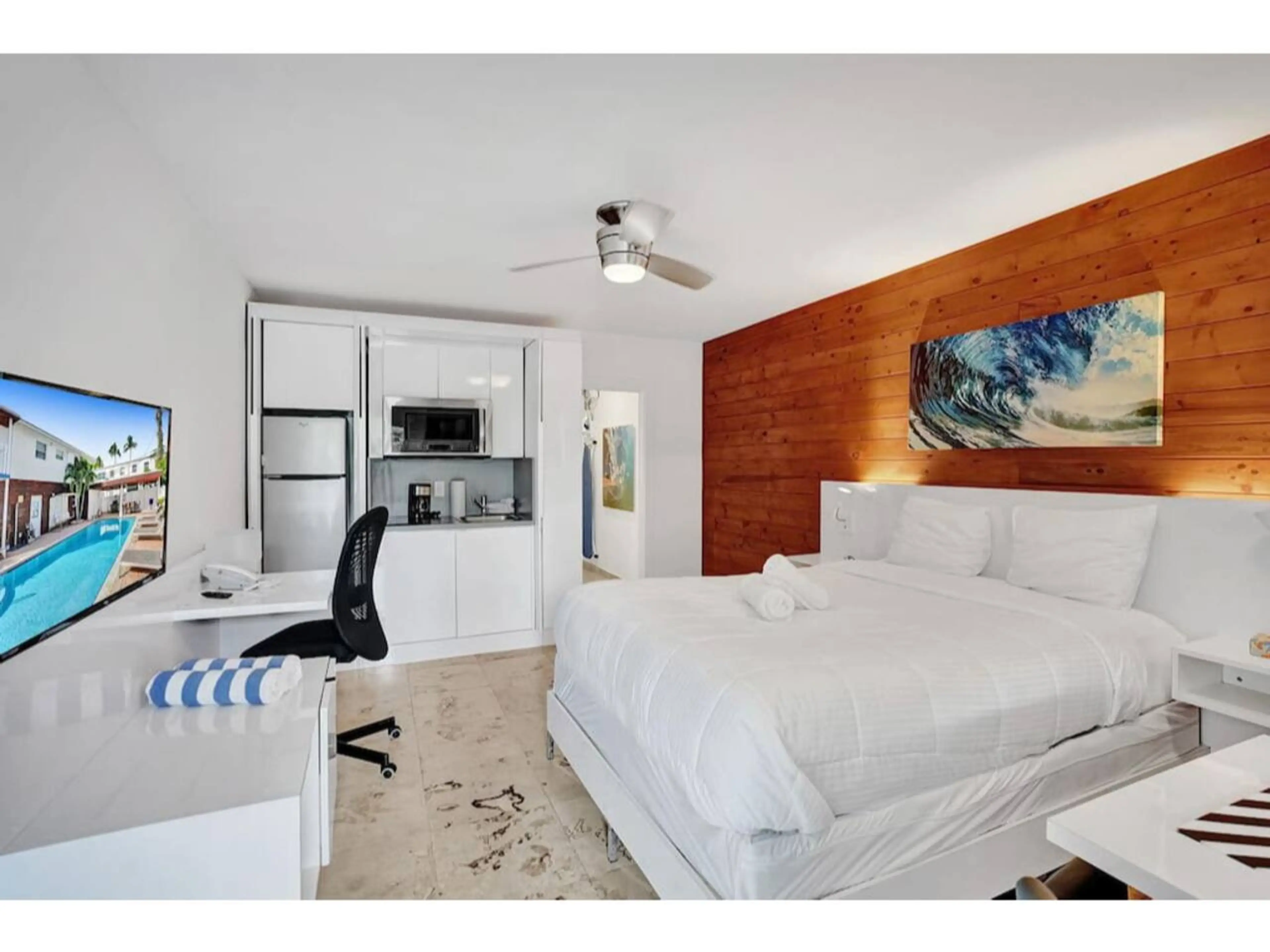 Enjoy a calm and stylish stay in this modern beach studio, just minutes from the shoreline. The space offers a comfortable double bed, a cozy dining spot, and a clean, updated bathroom with a wood-accent shower. Spend your days relaxing by the gated pool or exploring the pier, restaurants, and shops...
